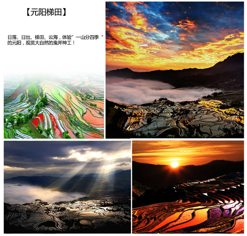早餐后,乘车前往世界遗址----元阳哈尼梯田(主要有4大景区:坝达景区包括箐口、全福庄、麻栗寨、主鲁等连片14000多亩的梯田和箐口民俗村景区老虎嘴景区包括勐品、硐浦、阿勐控、保山寨等近6000亩梯田,多依树景区包括多依树、爱春、大瓦遮等连片上万亩梯田。如此众多的梯田,在茫茫森林的掩映中,在漫漫云海的覆盖下,构成了神奇壮丽的景观。这些景区就是目前准备申报世界遗产的核心保护区。)抵达后观胜村梯田(3公里、行车10分钟) 【坝达梯田】(距离县城11公里,行车20分钟,观日落)坝达景点是申报世界文化遗产核心保护之一、坝达梯田气势磅礴、面积广阔、立体感强、从海拔800米的麻栗村河起、依山而上、3700多级梯田棉不断、廷伸至海拔2000多米的高山; 【核心区之一老虎嘴】;(距离县城28公里,行车1个小时,最大的梯田)世界遗产核心景区,位于几座高山的山坳中间,呈U字型,站在海拔1600多米的观景台上,脚下就是万丈悬崖,地势异常险要,是观赏落日的最佳之地。因两山突出形似张嘴怒吼的老虎,故名老虎嘴。 【哈尼山寨—箐口民族村】最具有代表性的。箐口梯田是最能展现梯田与人、人与自然的融合,梯田、溪流、树林、村庄四元素共同构成的梯田文化在这里浓缩。纤细或浓重不均等的梯田田埂线条极其优美,构成了一串串五线谱 |